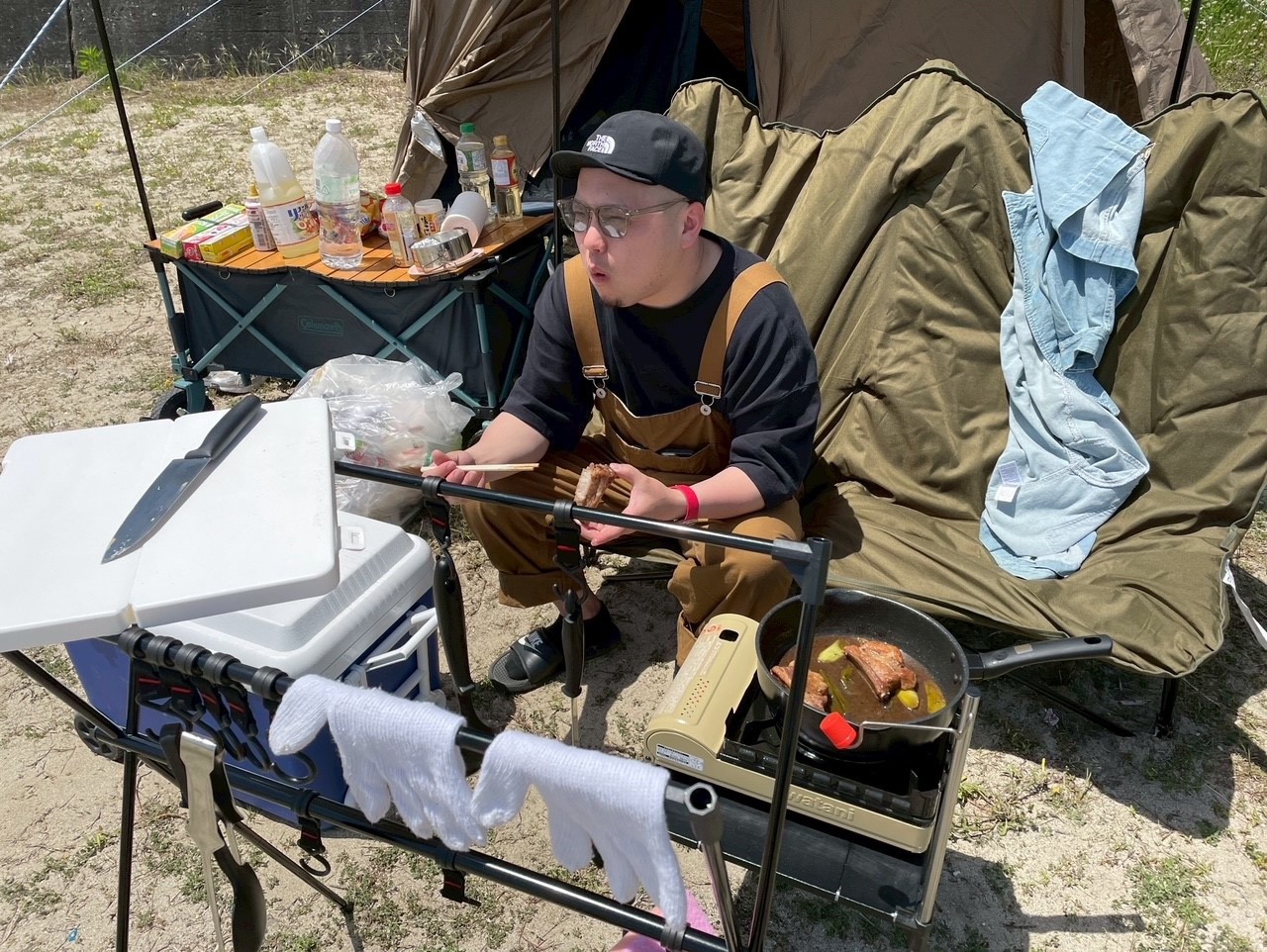 休日はアウトドアでリフレッシュ。加茂川周辺のキャンプスポットは特にお気に入りで、季節ごとに変わる空気や景色も楽しみの1つです。さらに、西条工場に来て初めて参加した「いもたき」では、川のそばで仲間と鍋を囲む時間が心地よく、印象に残っているそうです。