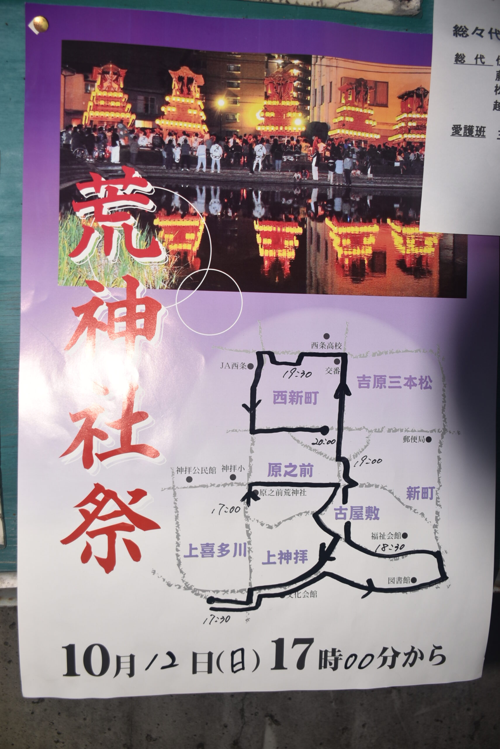 荒神祭の経路は、ポスターの地図にマッキーで書かれている。毎年同じルートではないので、来年見ることがあれば確認してほしい。なお、今年の荒神祭には上喜夛川樂車に同行させてもらったので、同樂車の写真が多くなる。