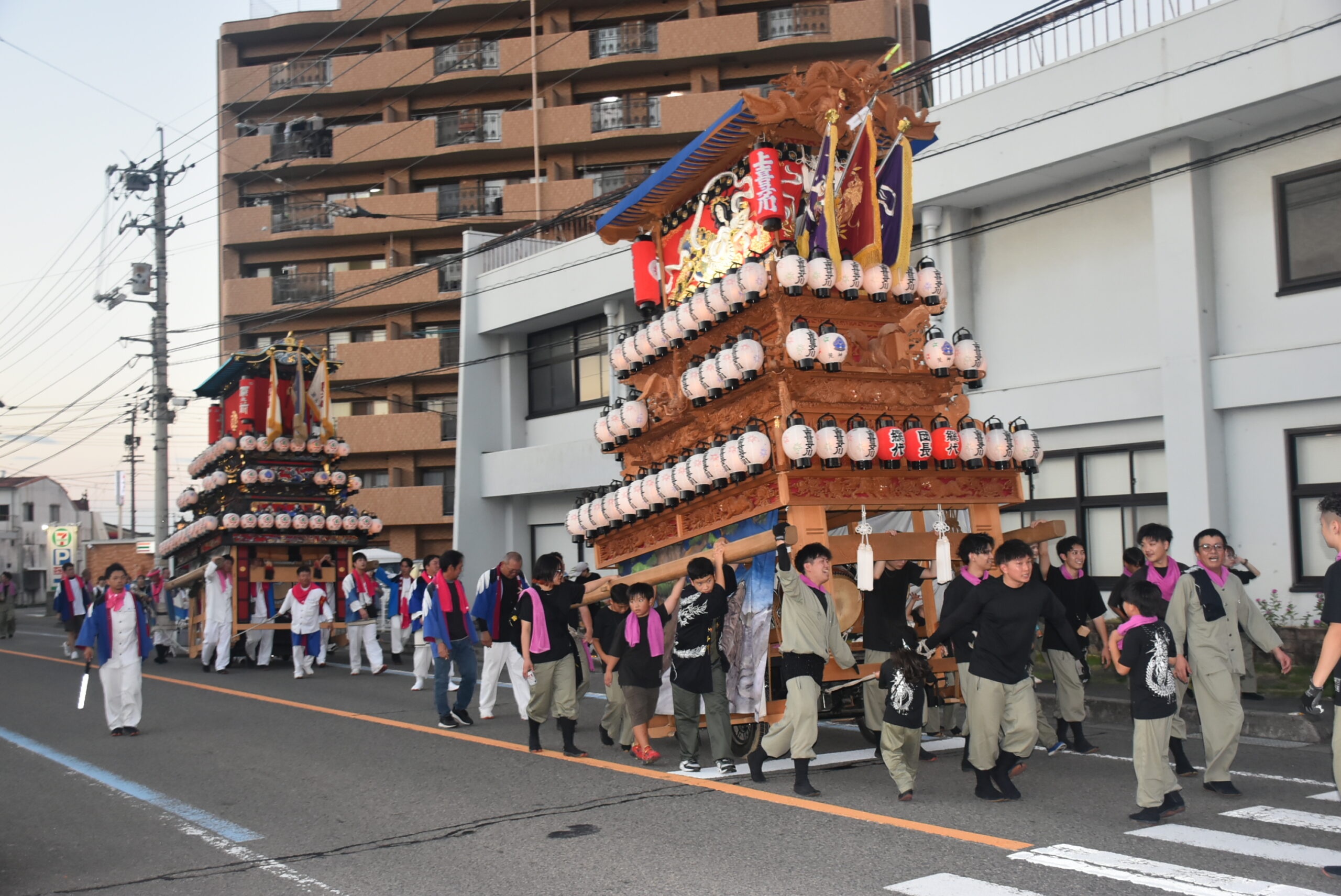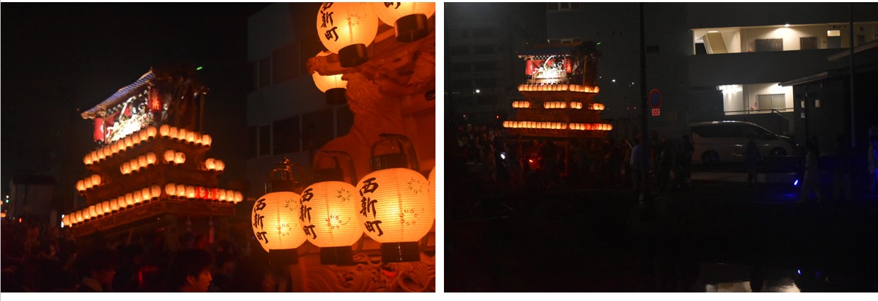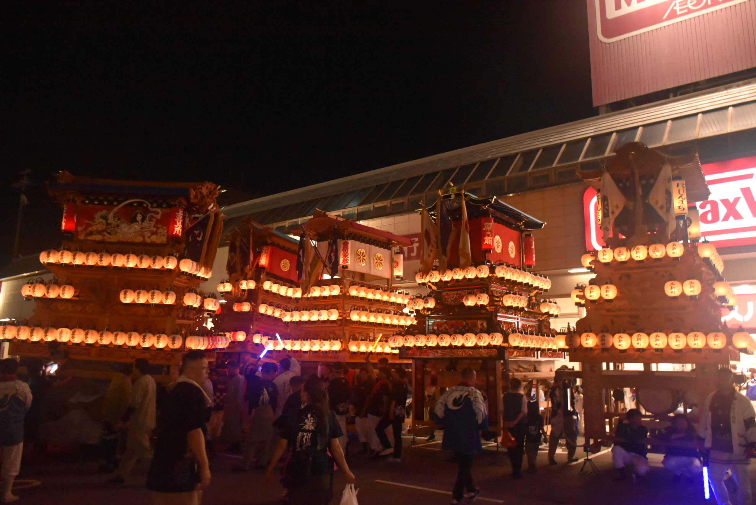 西新町樂車を先頭に、マックスバリュ西条神拝店へ向かう。並ぶ樂車は店舗内の照明で後光が差しているようであった。