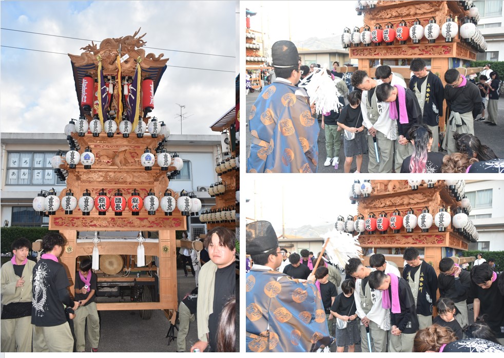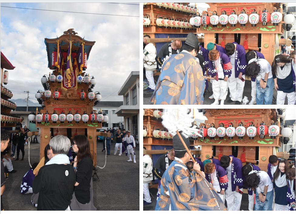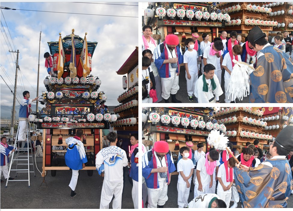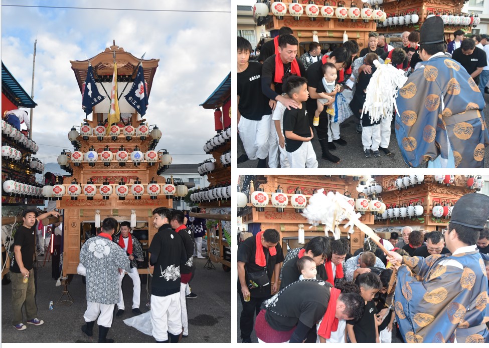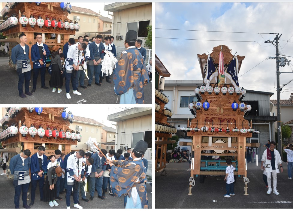 6 樂車の正面写真とともに、樂車前で行われた神事を写真で紹介する。また、神事には風伯神社の”花谷 空”宮司が取り仕切っている。