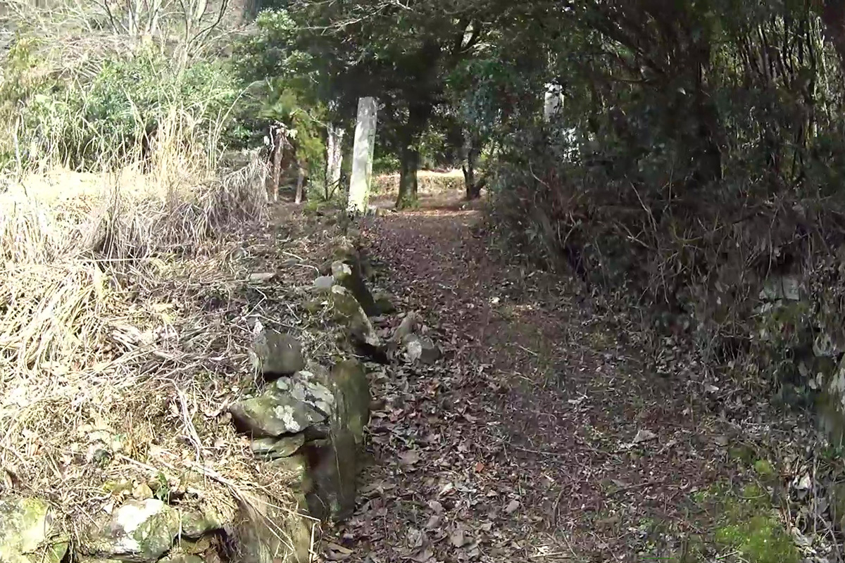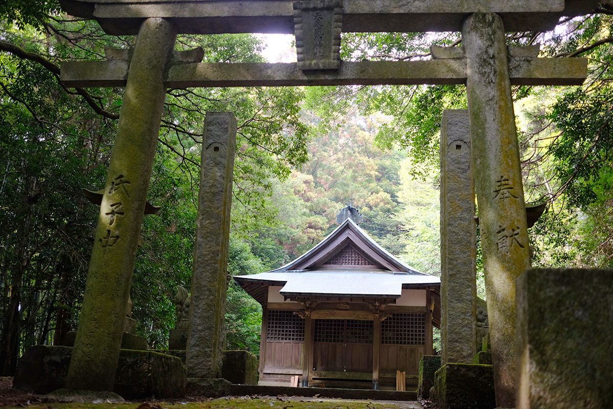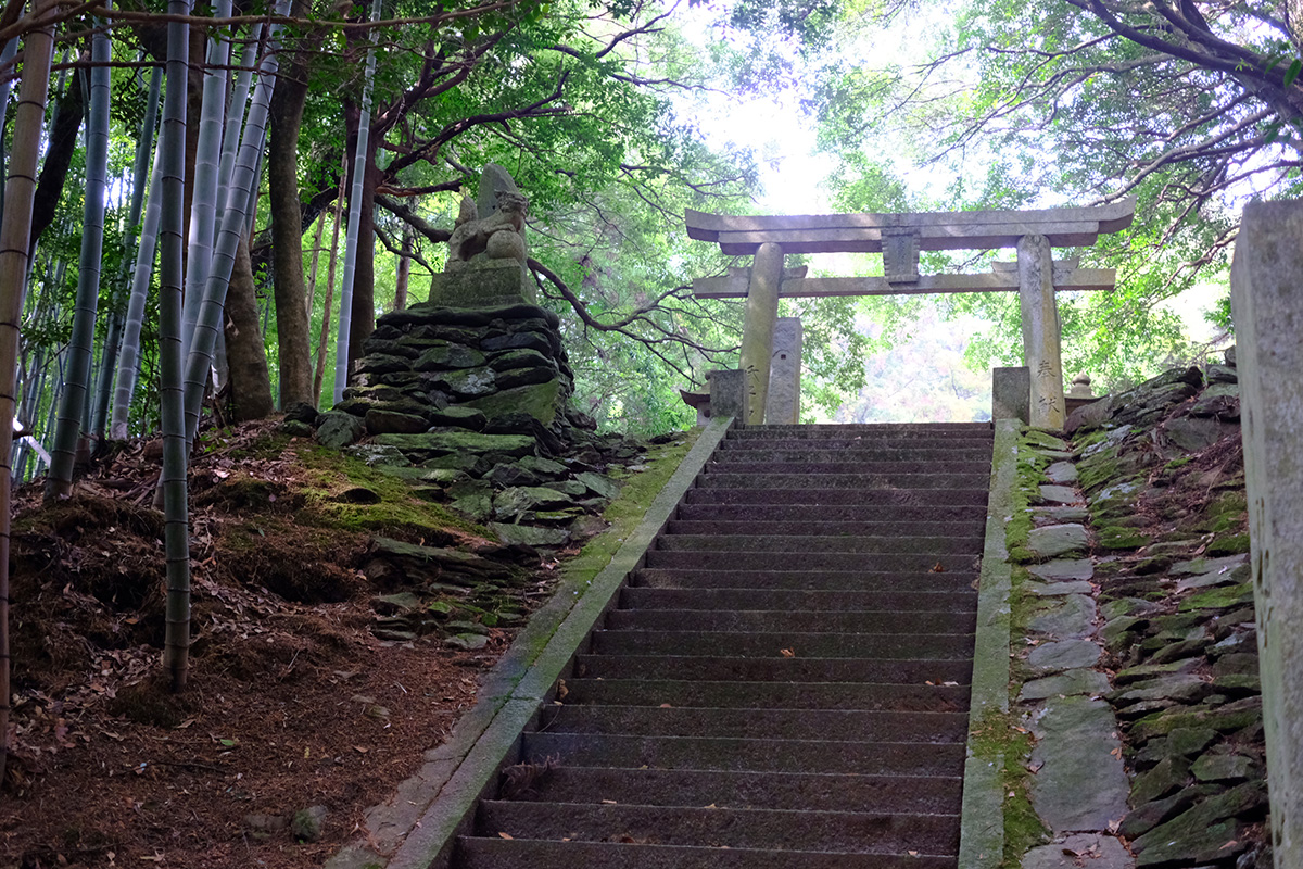 クルマを停めて山道を登っていくと誰も住んでなさそうな空き民家の横を通りながら100メートルくらい登ったところに神社の階段が現れました。