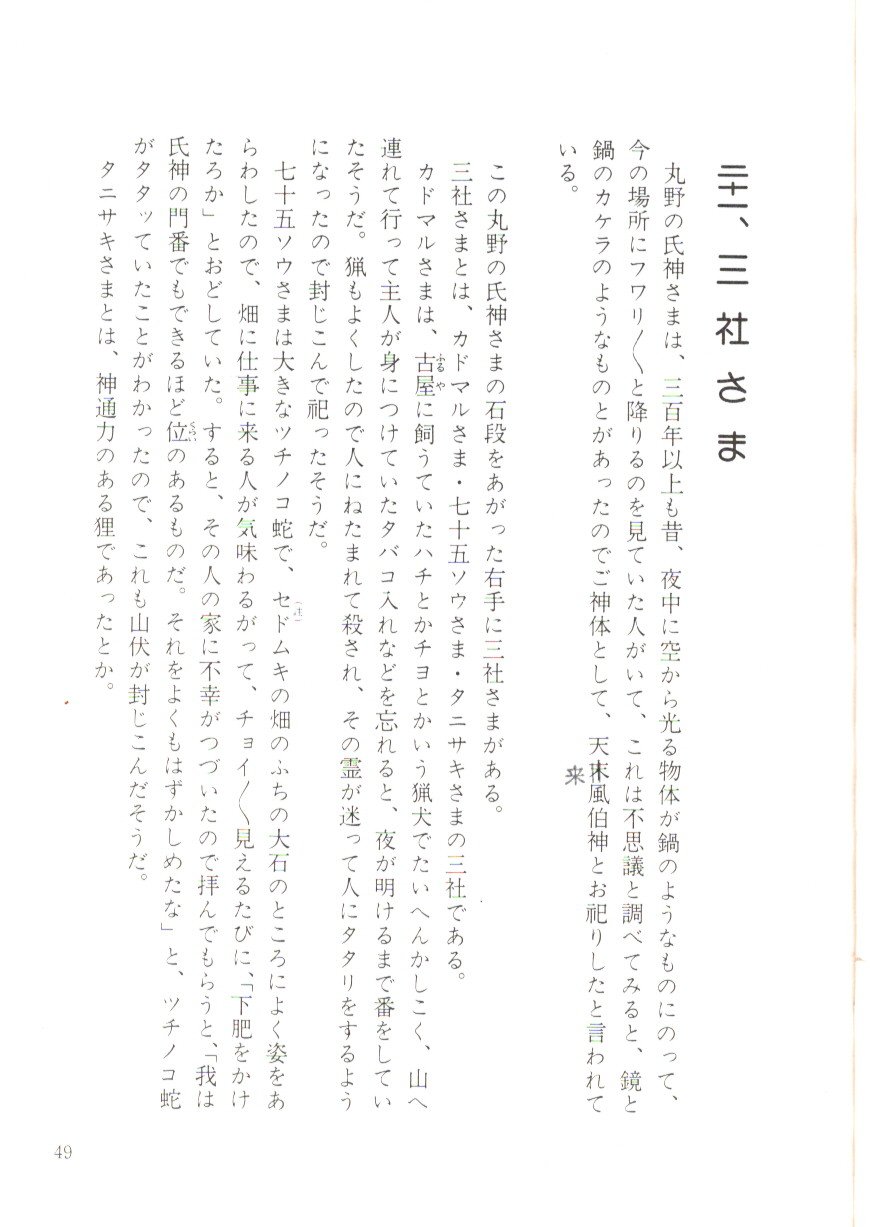 その本によると、右から七十五ソウさま、タニサキさま、カドマルさまとあり、それぞれ祟りのツチノコ、神通力のある狸、かしこい猟犬を祀っているそうです。