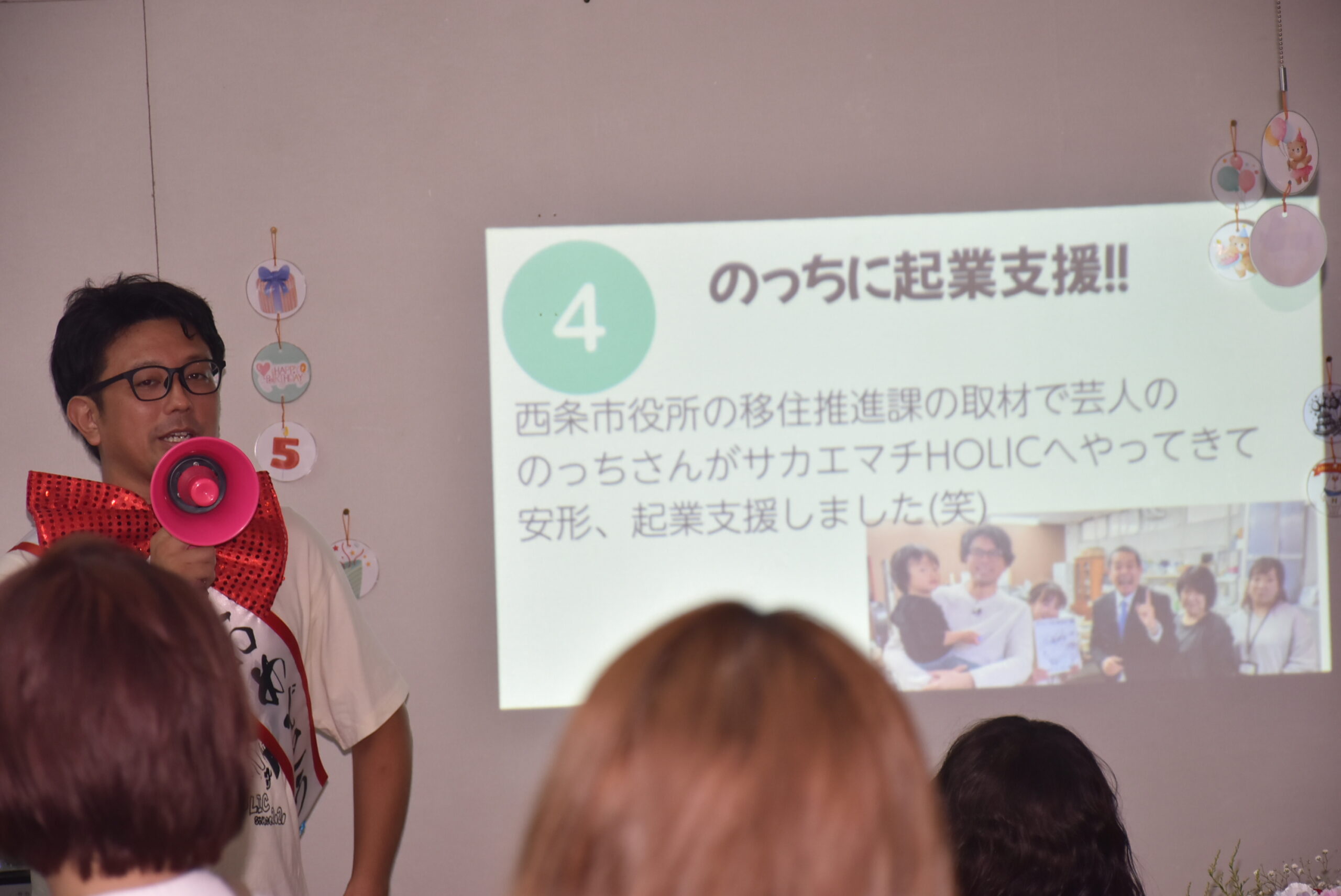 「西条市役所の移住推進課の取材で、芸人のノッチさんがサカエマチHOLIC へやってきて、安形、起業支援しました(笑)」すごいっっっ。