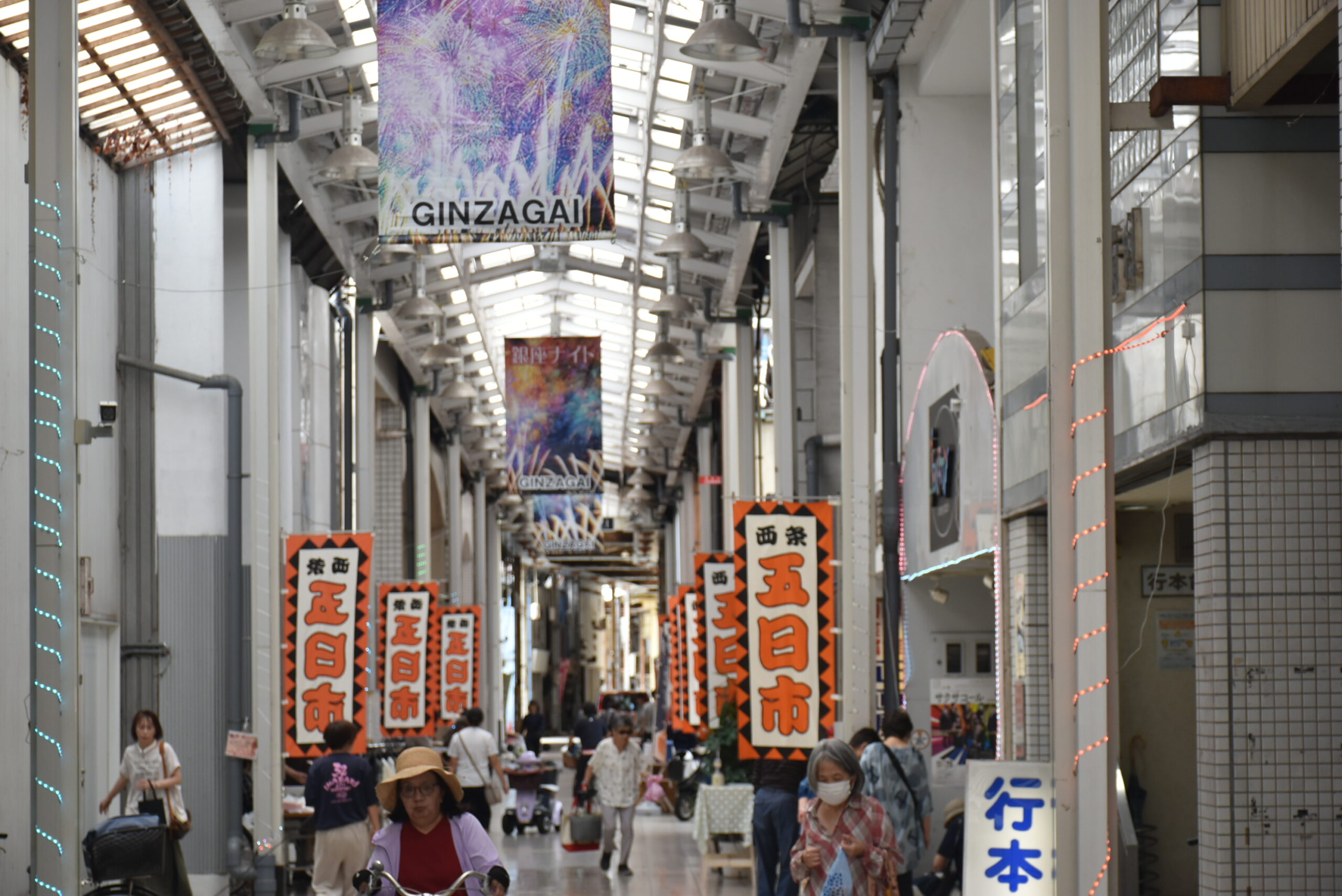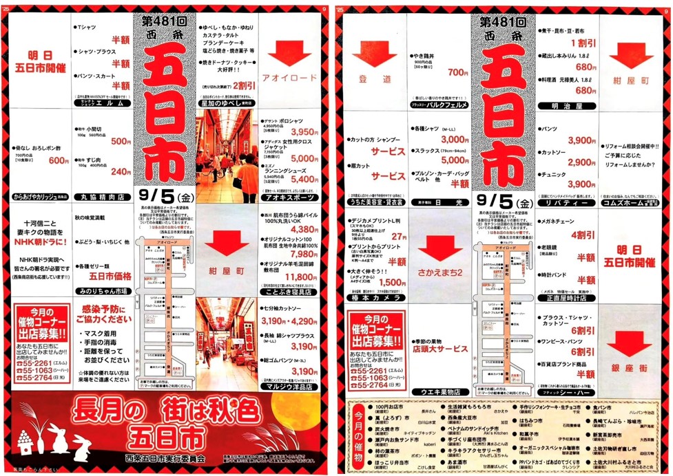 五日市は西条中心商店街(アオイロード、紺屋町、銀座街、さかえまち2、登道)の商店街が毎月5日に実施している。