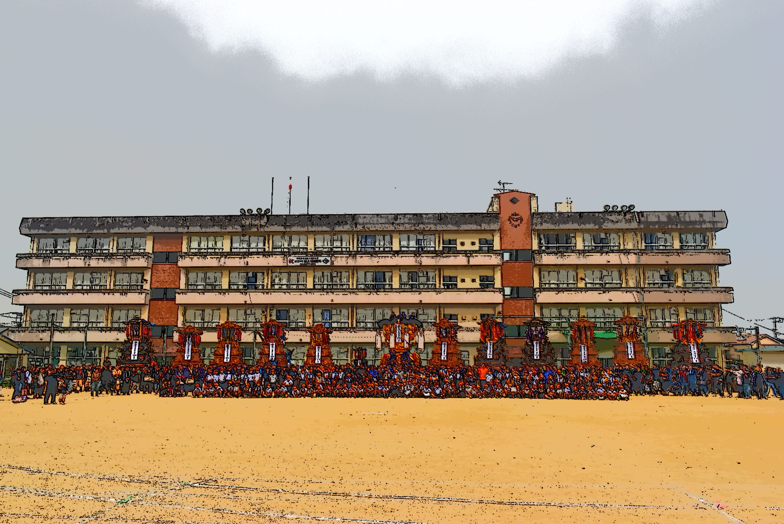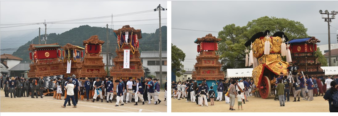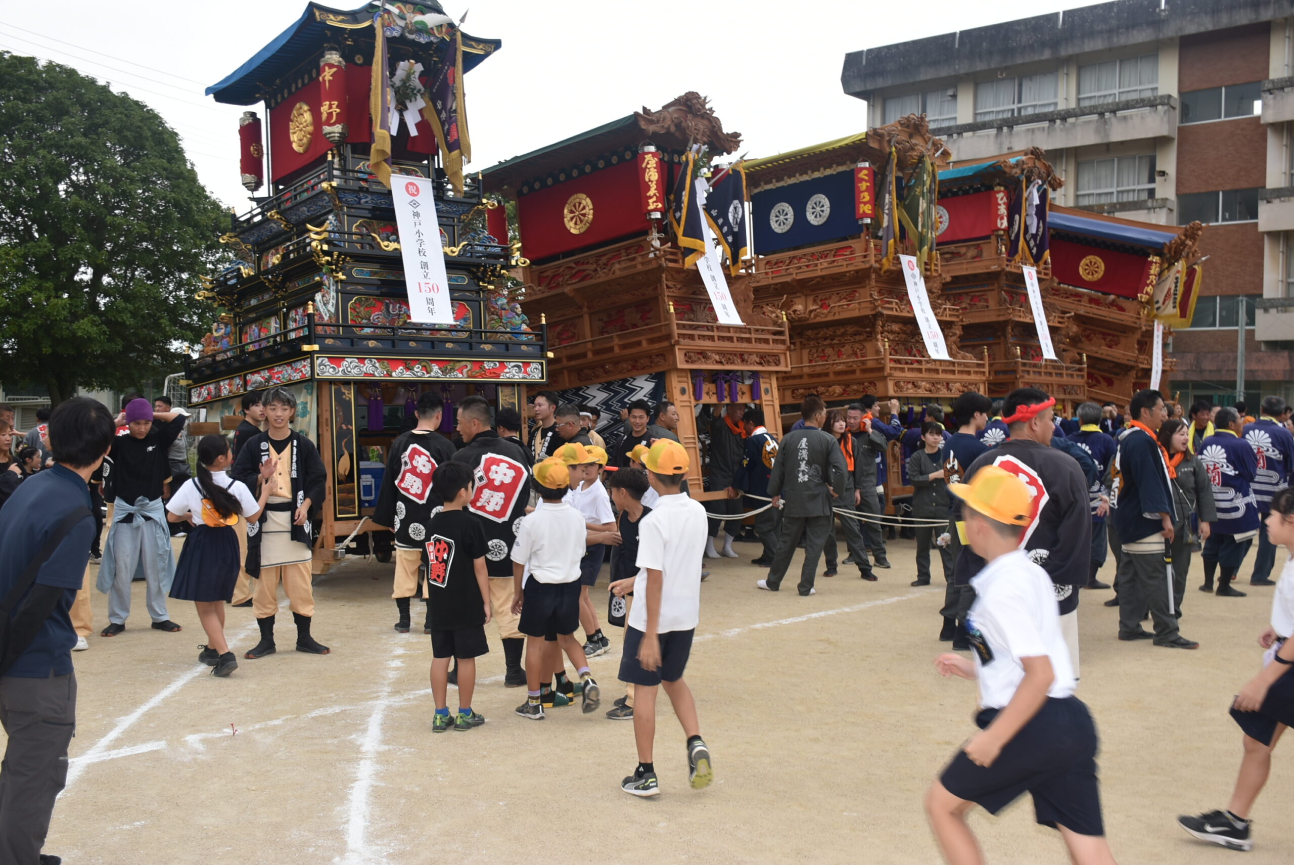 神戸地区の全ての“だんじり”11台と“みこし”1台、そして、神戸小学校所蔵の“こどもだんじり”1台の計13台が、神戸小学校の運動場に勢ぞろいした。