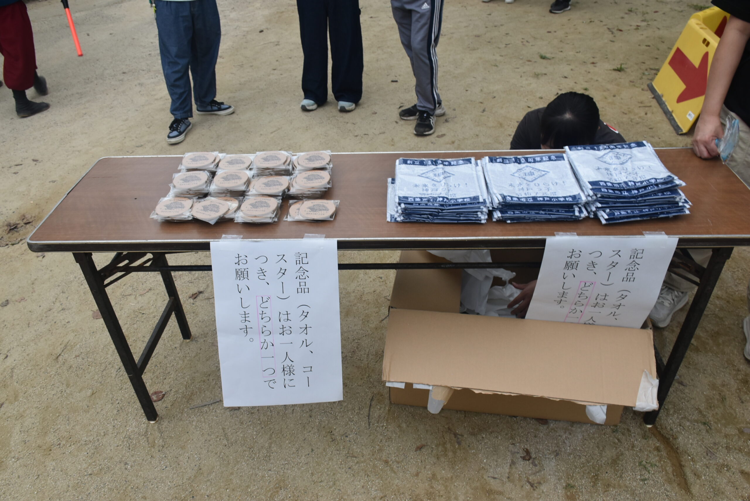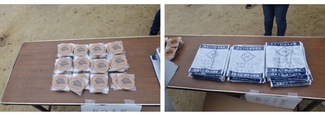 また、神戸小学校創立記念日150周年を記念したグッズとして、ミニタオルと神戸小学校のクスノキを印字したコルクコースターを、一人当たりどちらか1 個というカタチで配布をしていた。