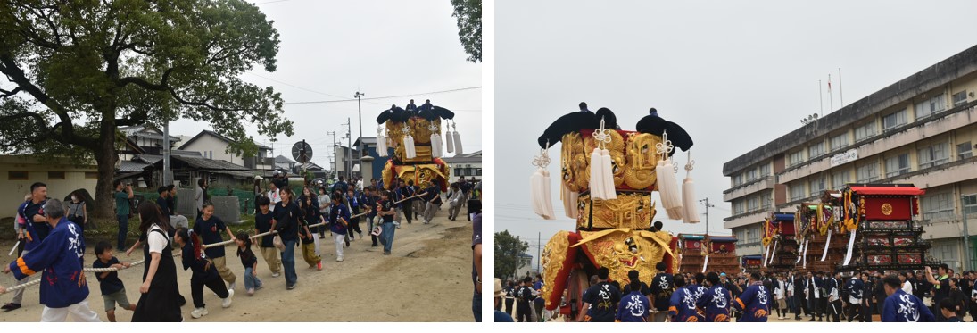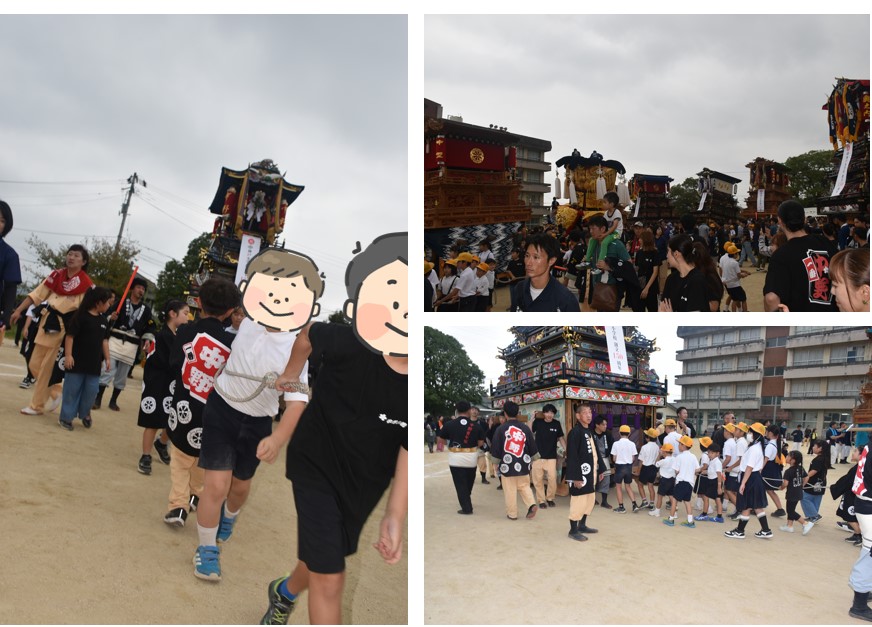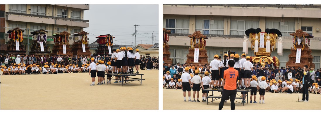 集会のメインイベントの一つ、運動場での”だんじり”と”みこし”の練り歩きを実施。普段、担ぎ慣れている”だんじり”や”みこし”を操り、伊曾乃神社例大祭さながらに練り歩いた。