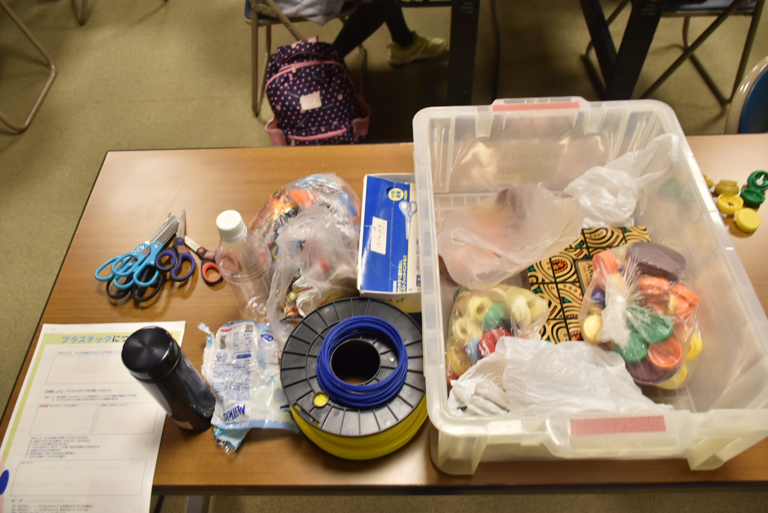 東予高校の先生による便利な素材プラスチックについての説明後、西条市飯岡にある「株式会社フラスコ」提供の金型ペットボトルの蓋を使ってものづくりを行った。
