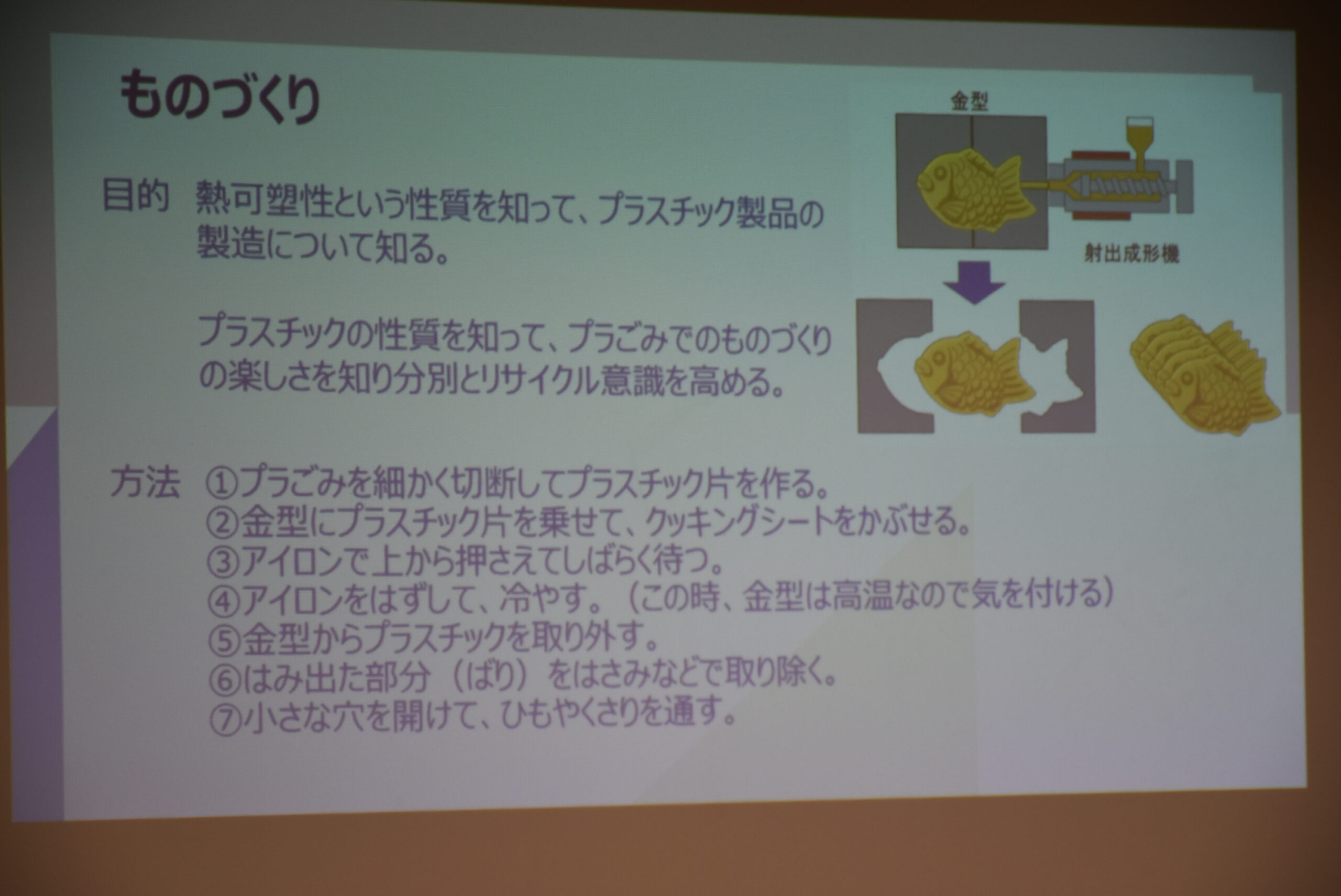 スライドでその作り方を紹介し、アイロンを使う時の注意事項や使う材料について、また、全体の流れも説明があった。