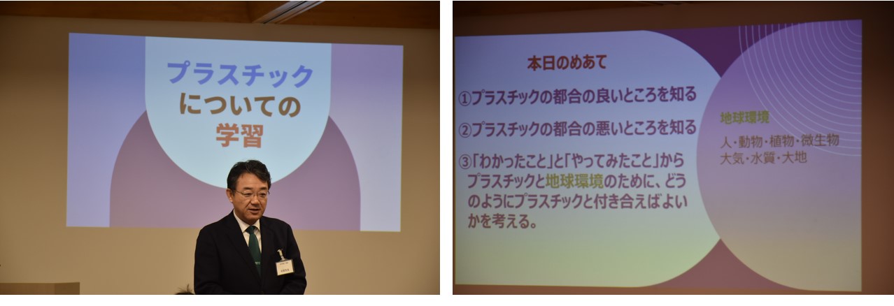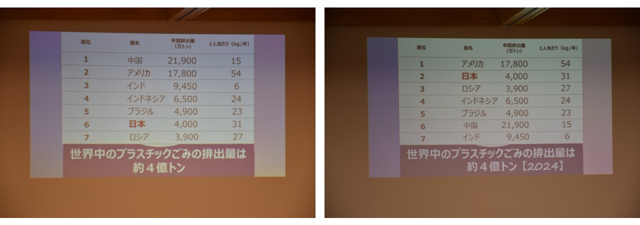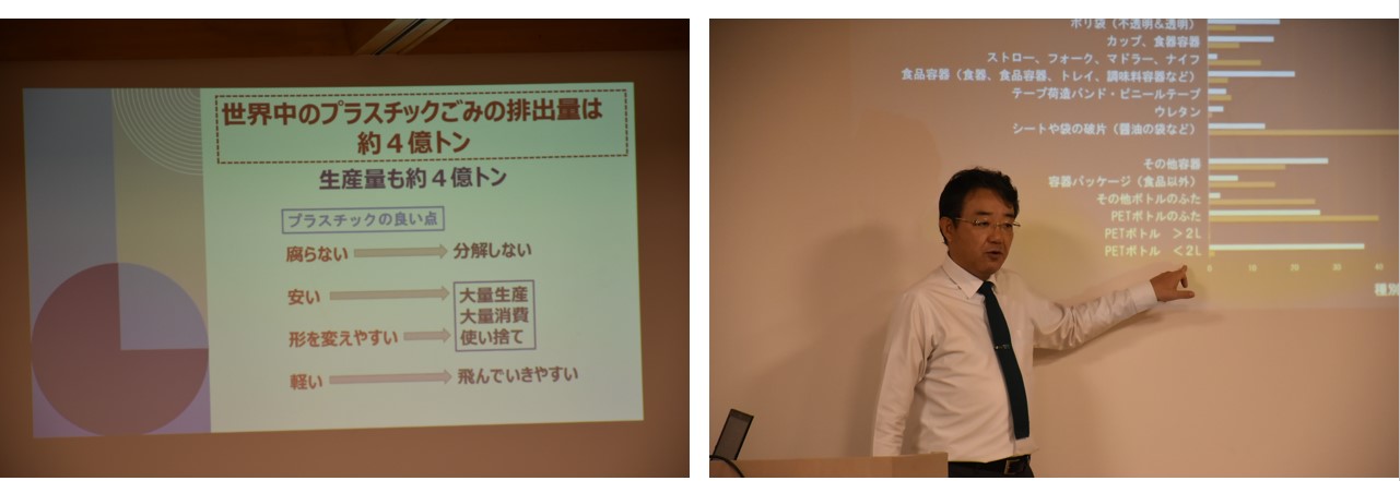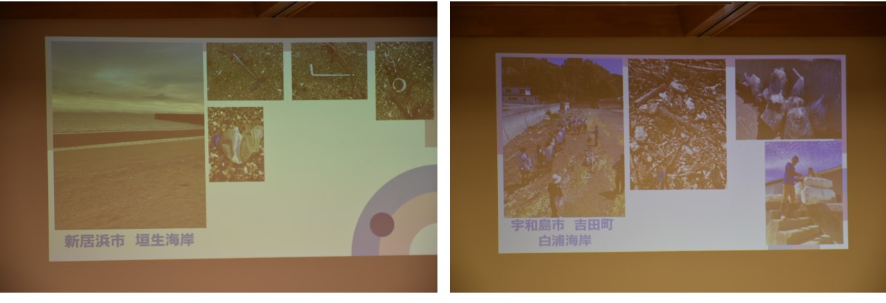 次に東予高校の井原教頭より「プラスチックについての学習」の説明があった。新居浜市の垣生海岸や宇和島市の白浦海岸に打ち上げれるゴミにはどんなものがあるか、また、世界トップ7のゴミ排出国の年間排出量(単位:万トン)や国民一人当たりの年間排出量(単位:kg)が紹介された。