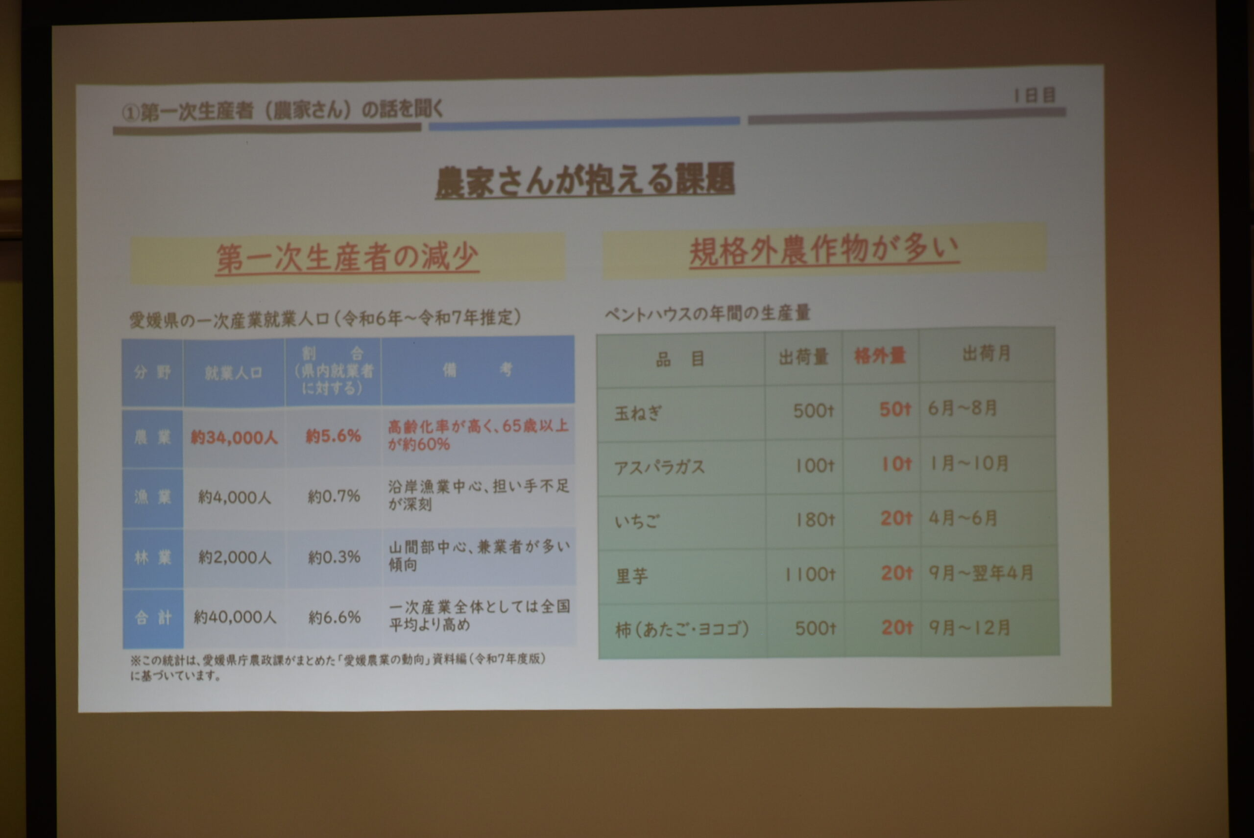 最初に(株)PENTAFARM の山内氏(2.-③)より、地元の農業課題が紹介された。