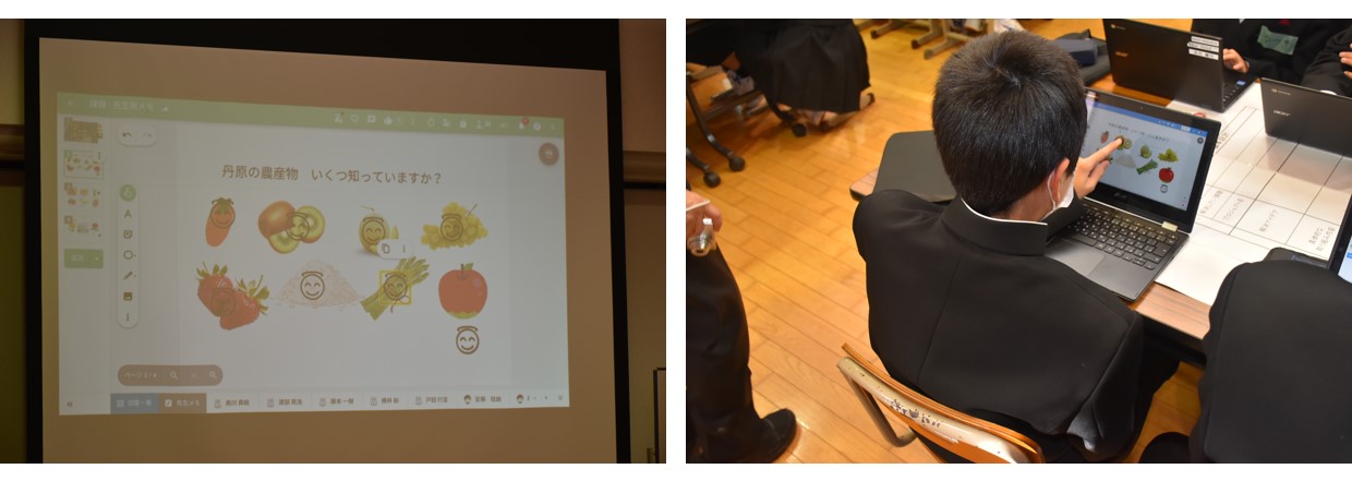 そして、丹原出身の教師による町内の特産品を、生徒各自のパソコンやタブレット等で問題を出しながら説明していた。