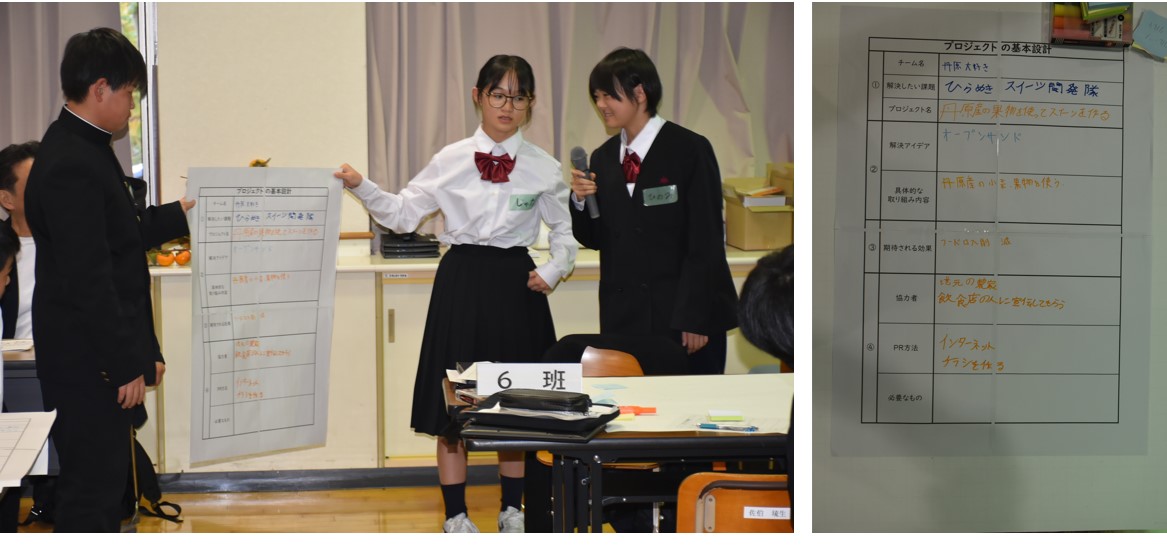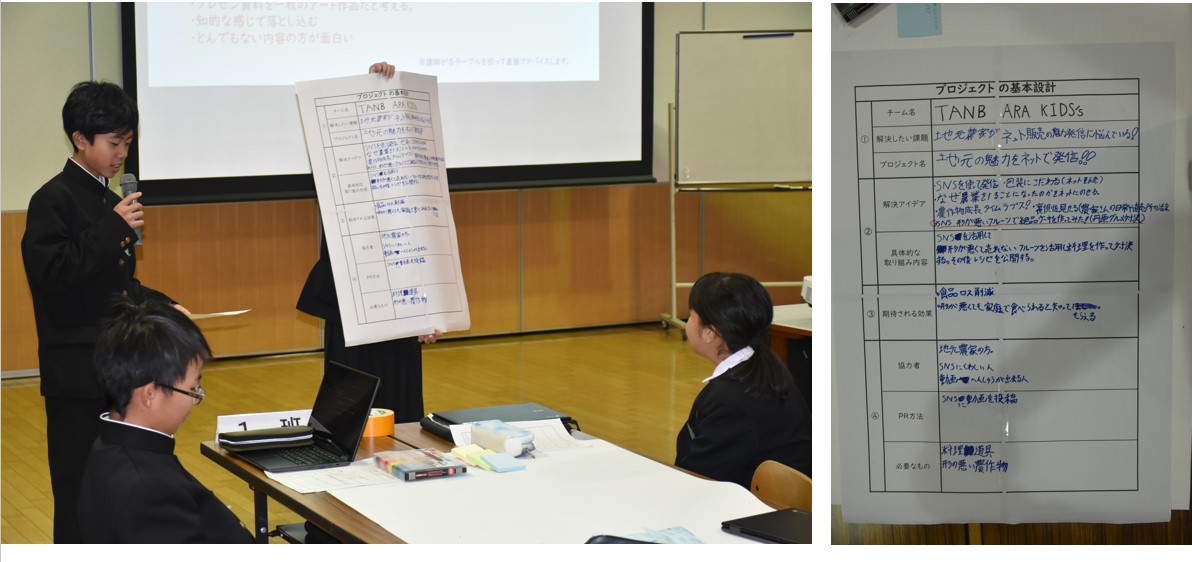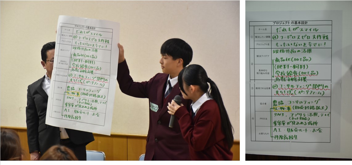 本校生徒(中学生チーム)、保護者、地域の方や丹原高校の先生と丹原高校生(大人チーム)を加え、地元の農家の方や多様な分野の専門家と「対話」を重ね、地域の農業課題(第一次生産者の減少や規格外農作物が多いなど)の解決を目指す。