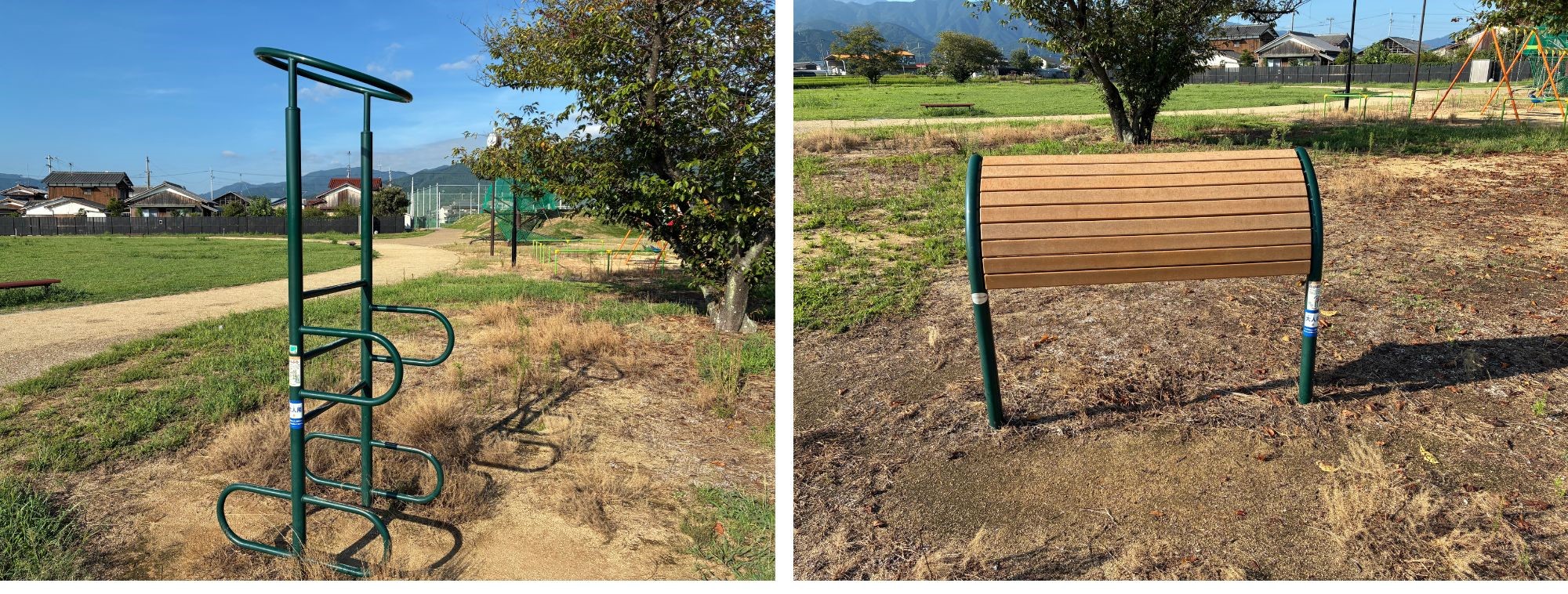 この丘を降りて少し歩くと、健康遊具エリアがありました。