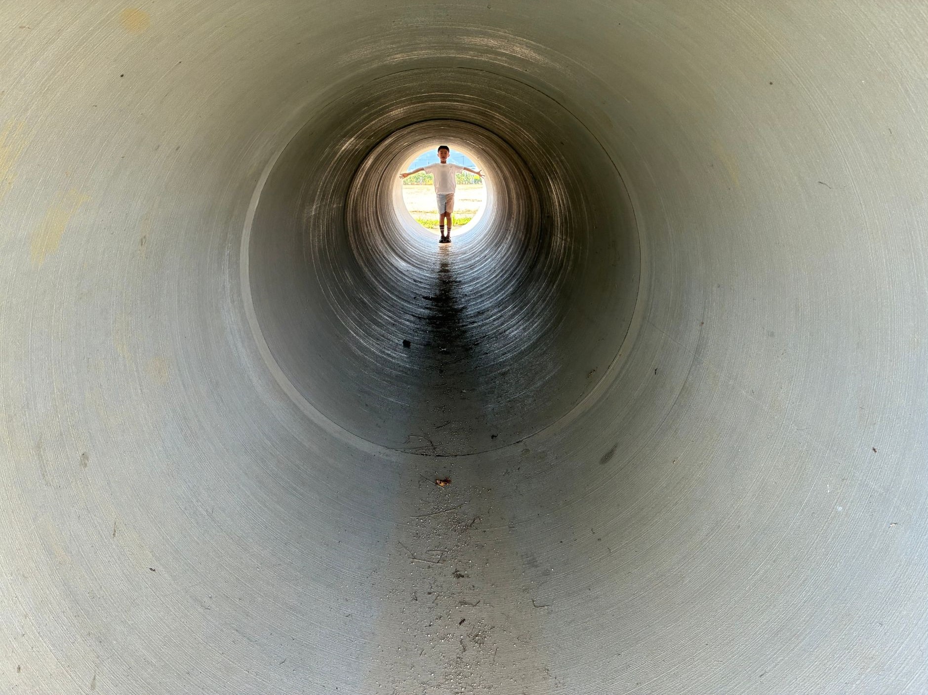 この土管は、丘の下に埋まっていて、その高さはだいたい1mくらい。小学3年生の息子が少しかがんで行き来できるくらい。