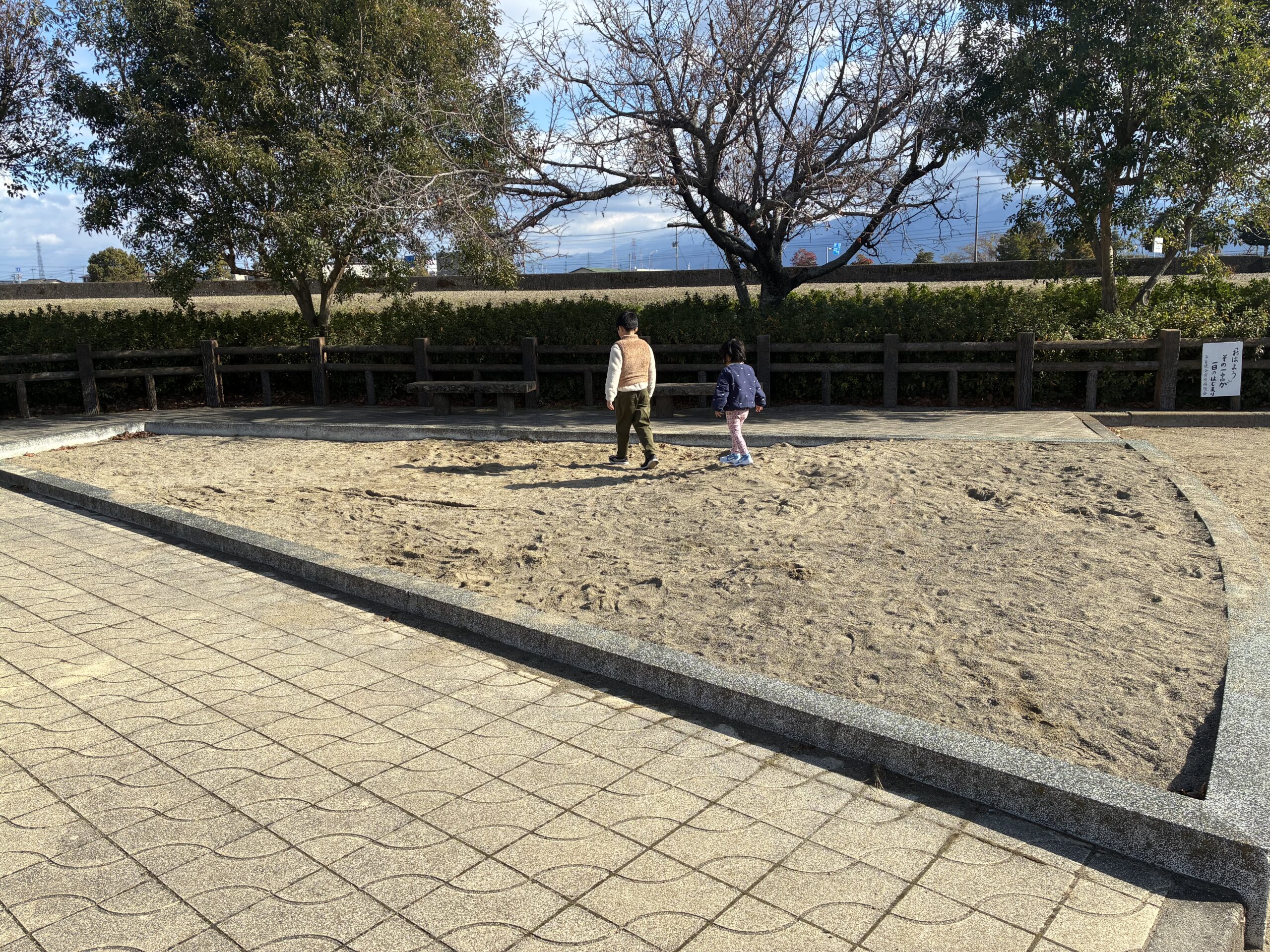 まずは、砂場に到着。遊びたいところですが散策優先のため、砂場の大きさと砂の感触だけ体験して、次の場所へ。