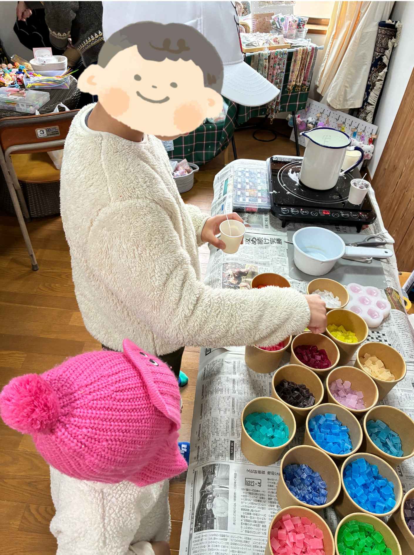 その後、10色以上の四角い蝋の中から好きな色を好きな数だけ取り、紙コップに入れて店員さんへ渡します。