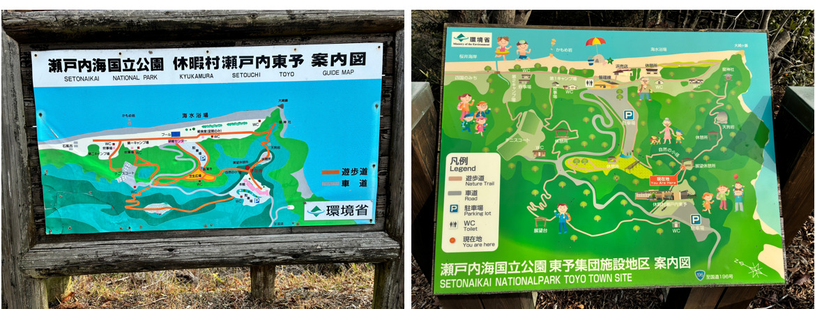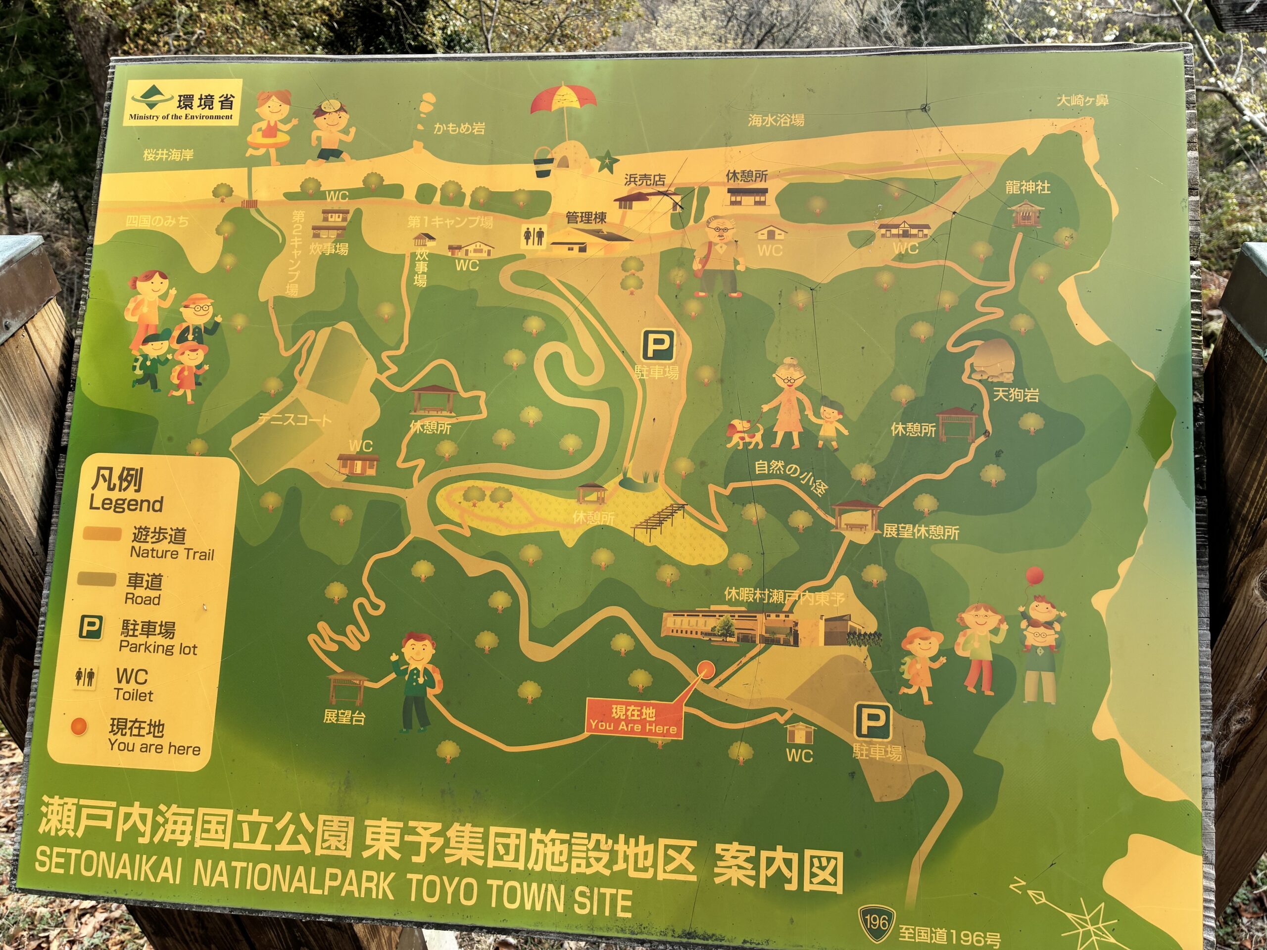 宿泊施設の方へ少し歩くと「瀬戸内海国立公園 東予集団施設地区 案内図」と書かれた地図を発見。