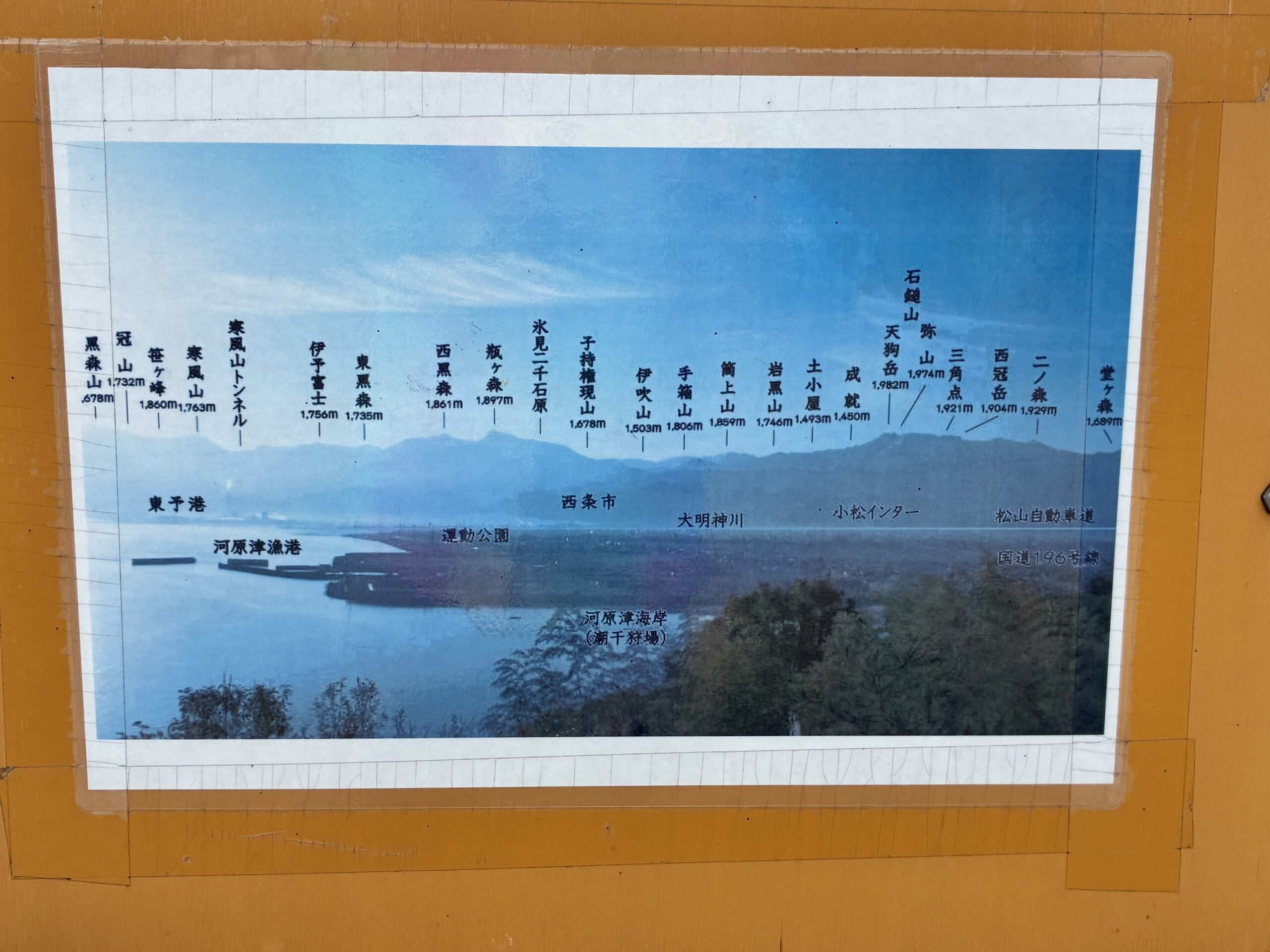 柵の所には、晴れた日に撮影された思われる石鎚山とその周辺の山たちの集合写真が載っている看板がありました。