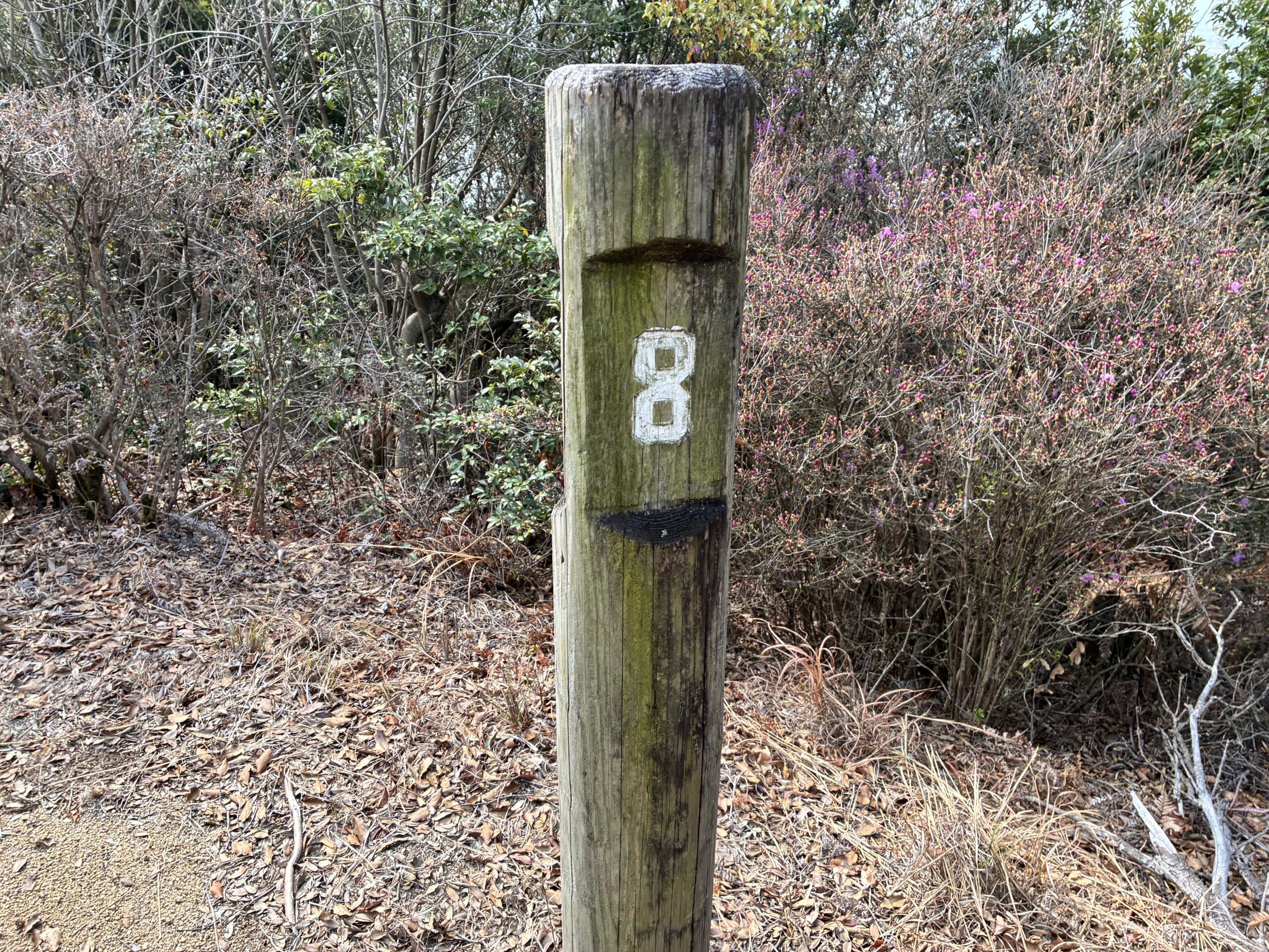 階段を登ったところに再び休憩所があり、その傍には、「8」の文字が書かれている木の杭がありました。