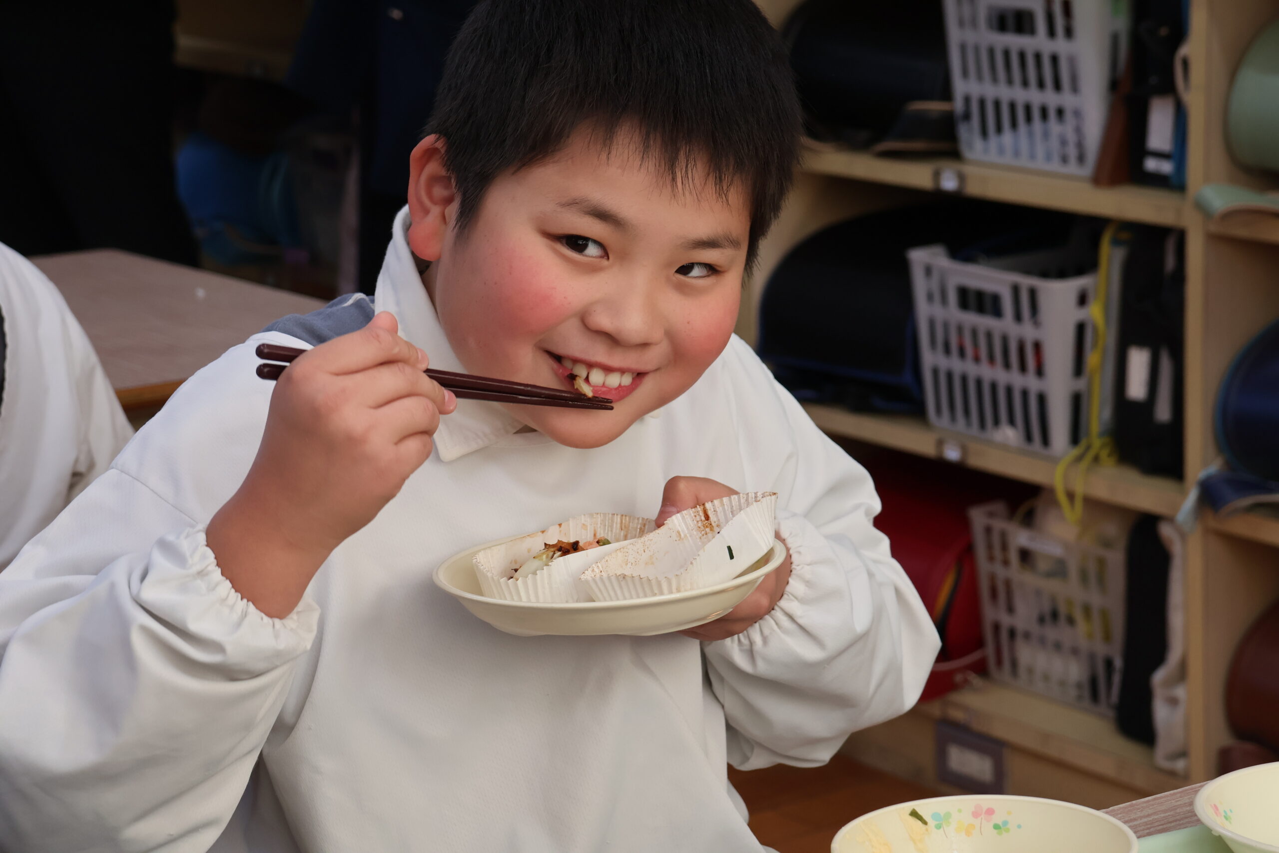 「やわらかくておいしい」「何個でも食べられる!」など児童たちはうれしそうにサイモンを味わっていました。