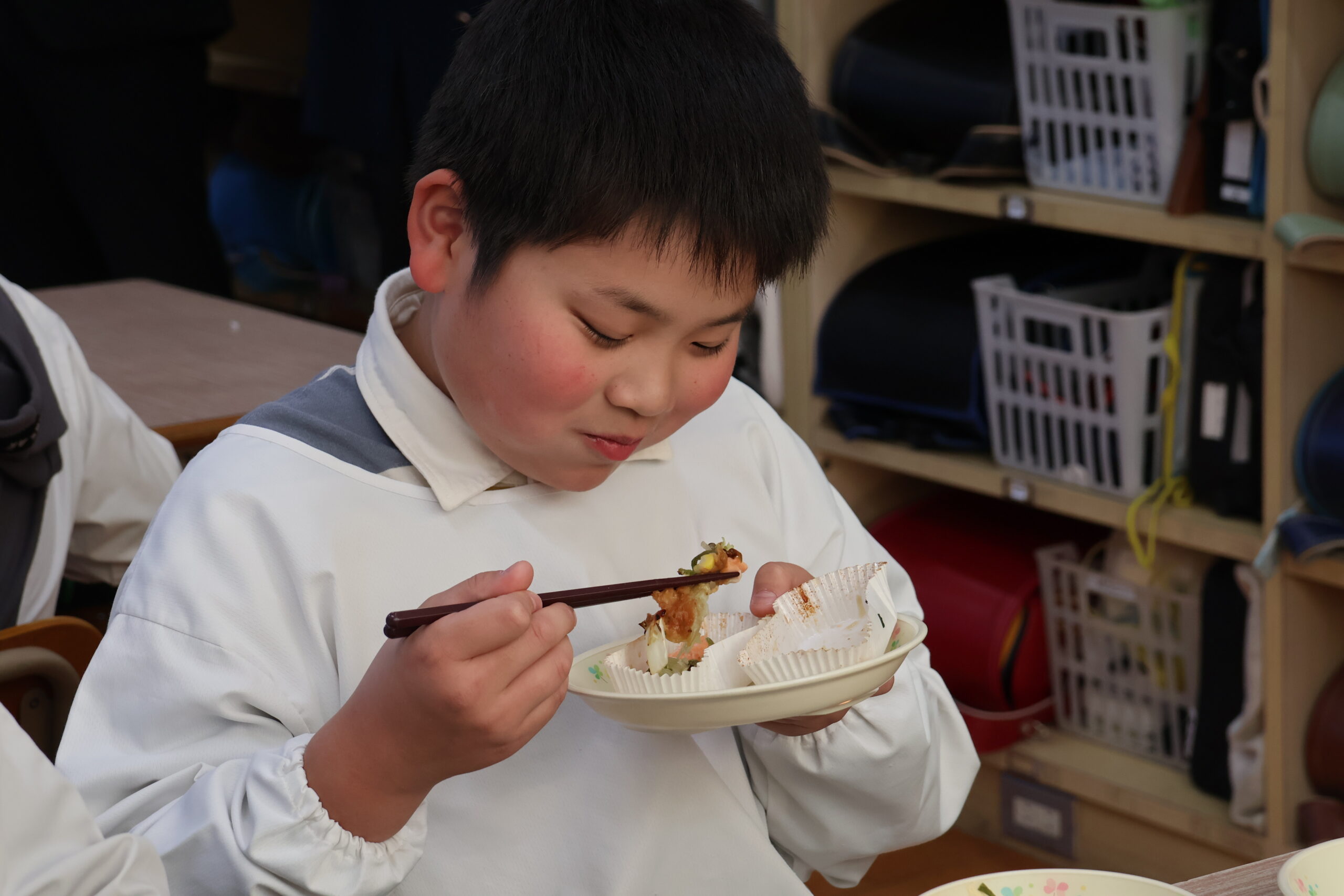 じゃんけんで見事勝利した児童は「すごくうれしくて、おいしい!」と笑顔でサイモンを食べていました。